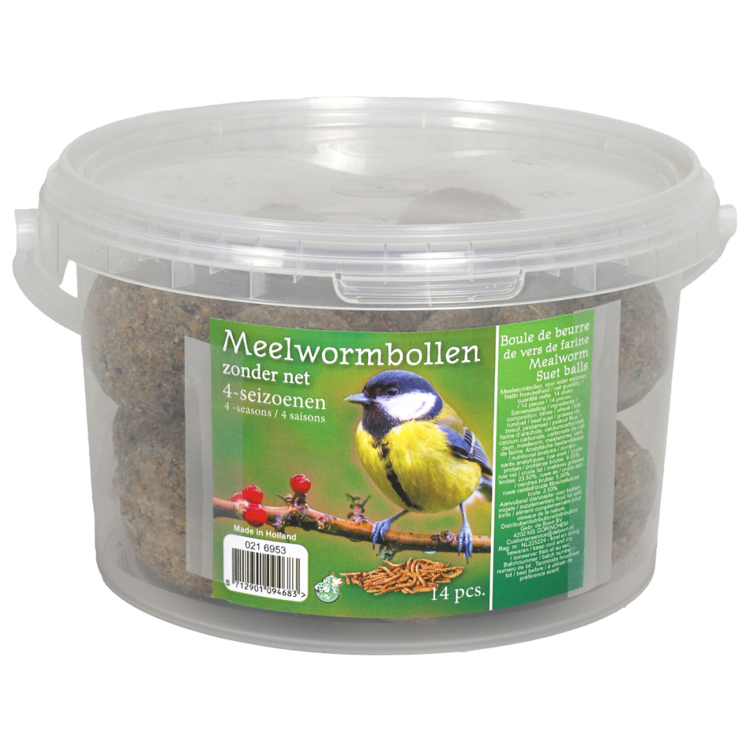 Verwen de vogels in je tuin met deze emmer vol voedzame 4-seizoenen meelwormbollen. De 14 vetbollen zijn samengesteld uit hoogwaardige ingrediënten zoals meelwormen, granen en plantaardige vetten. Een smakelijke en energierijke traktatie voor onder allerlei soorten tuinvogels!