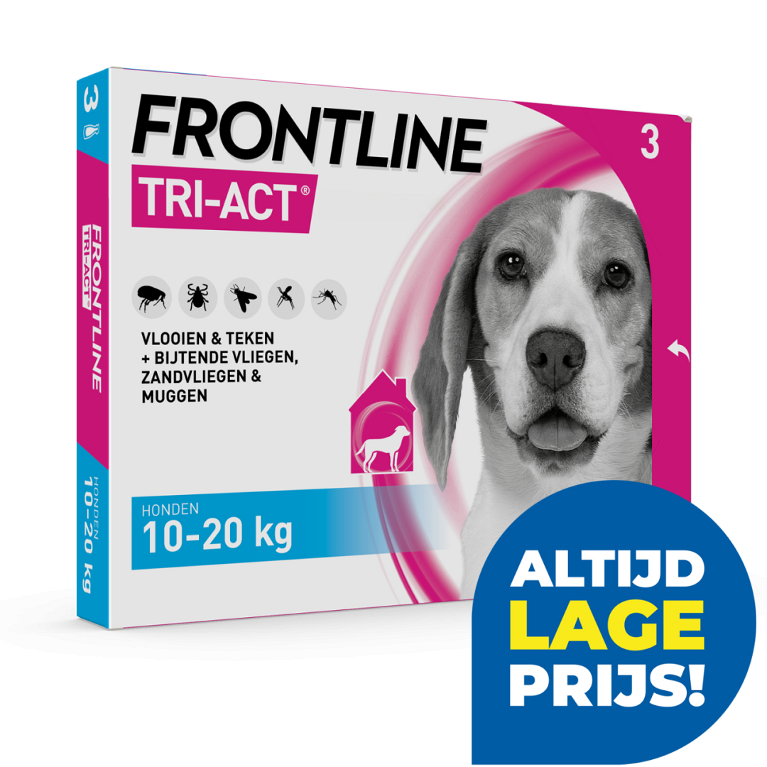 Frontline Tri-Act is een gemakkelijk aan te brengen druppels die je hond een bescherming biedt tegen 5 soorten parasieten: vlooien, teken, zandvliegen, stalvliegen en muggen. Ook je huis blijft dankzij dit product vrij van vlooien : de vlooien worden gedood nog voor ze de tijd hebben eieren te leggen.