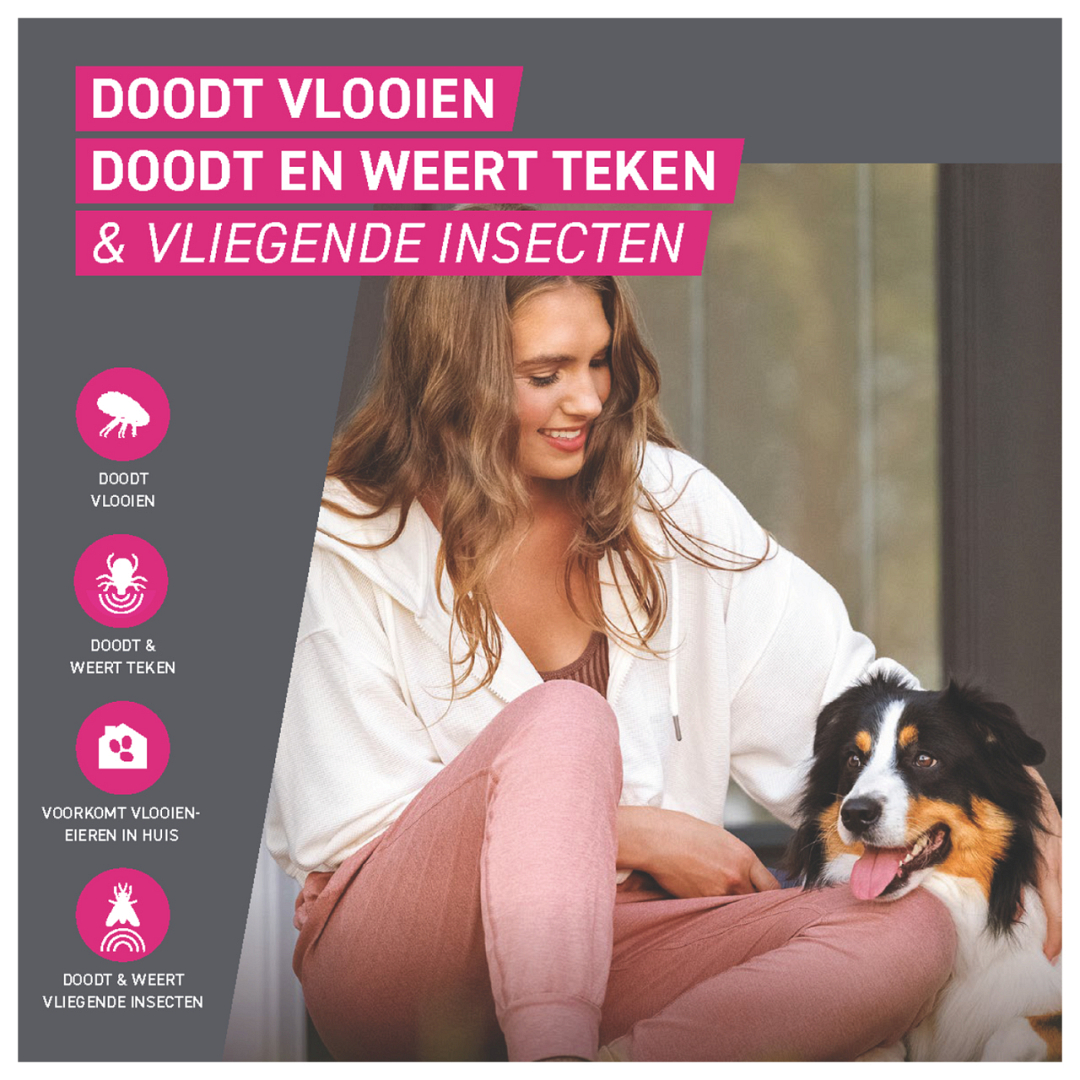 • Beschermt je hond 4 weken tegen nieuwe vlooien, teken en vliegen insecten (3 weken tegen zandvliegen)