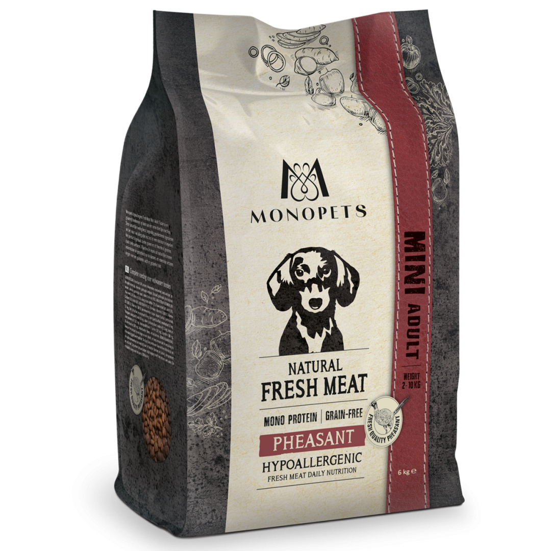 Monopets hypoallergeen Fresh Meat Mini Adult Fazant is een smaakvol graanvrij hondenvoer op basis van één verse dierlijke eiwitbron. Deze natuurlijke voeding bevat zorgvuldig geselecteerde ingrediënten om het risico van allergische reacties tot een minimum te beperken. Het product is gemaakt zonder granen en zit boordevol groenten en fruit, zoals zoete aardappel en appel. Waardevolle vezels uit prebiotica en natuurlijke bronnen ondersteunen de gezondheid van de darmen, en essentiële vetzuren zorgen voor een glanzende vacht en gezonde huid.