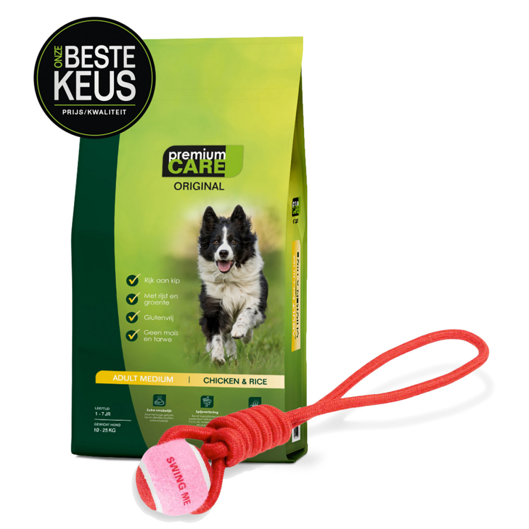 Premium Care Original - Adult Medium Chicken & Rice is een glutenvrije, complete droge hondenvoeding, speciaal ontwikkeld voor volwassen honden. Deze speciale formule beantwoordt perfect aan de voedingsbehoeften van honden van middelgrote rassen en draagt bij tot een optimale levenskwaliteit.