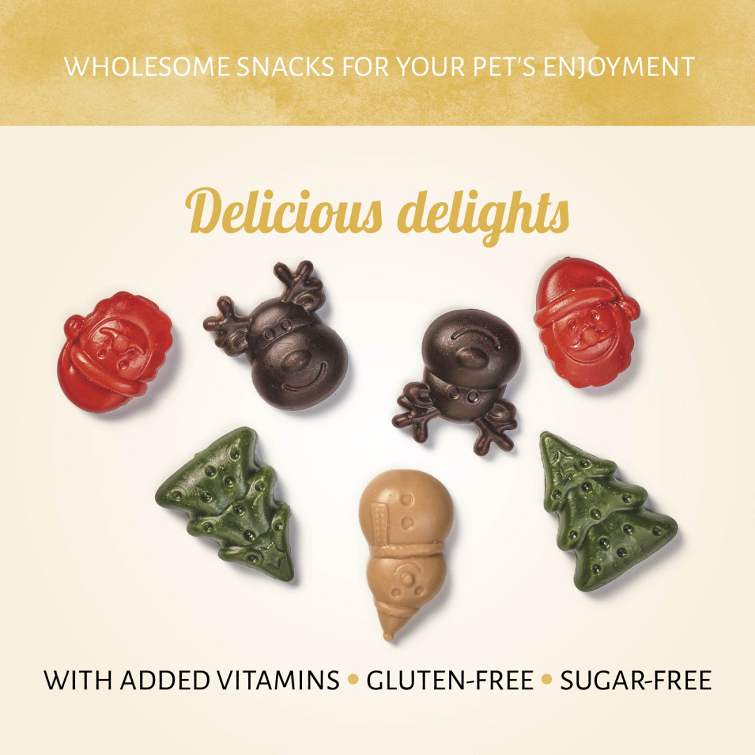 De collectie bestaat uit een verzameling feestelijke vormen voor jouw geliefde hond, van de Kerstman tot een traditionele sneeuwpop. Een ster vol heerlijke lekkernijen.