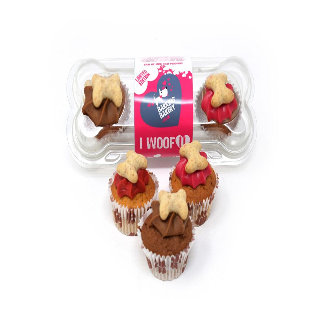 Een hapklare Trio van mini iced woofins, 2 vanille en 1 johannesbrood spons elk versierd met een vleugje van onze beroemde yoghurt topping en een knapperig botvormig hondenkoekje.