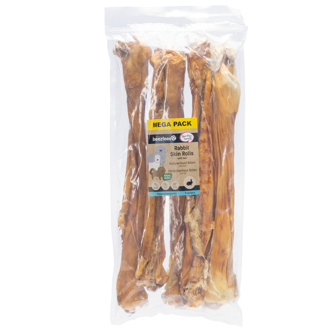 De Beeztees Konijnenhuid Rol met haar is een gezonde en smakelijke snack voor jouw hond. Deze 100% natuurlijke snack bevat slechts één eiwitbron en is volledig vrij van kleur- en smaakstoffen en gluten. Het aanwezige haar heeft een nuttige werking: het borstelt de maag en geeft probiotica af in de dikke darm. Dit ondersteunt de natuurlijke darmreiniging en kan helpen bij dunne ontlasting. Tijdens het kauwen maakt je hond endorfine aan, wat zorgt voor ontspanning. Ook draagt het langdurig kauwen bij aan sterke kauwspieren en een gezonde mondhygiëne, dankzij de aanmaak van speeksel en enzymen die het gebit en tandvlees op natuurlijke wijze ondersteunen.