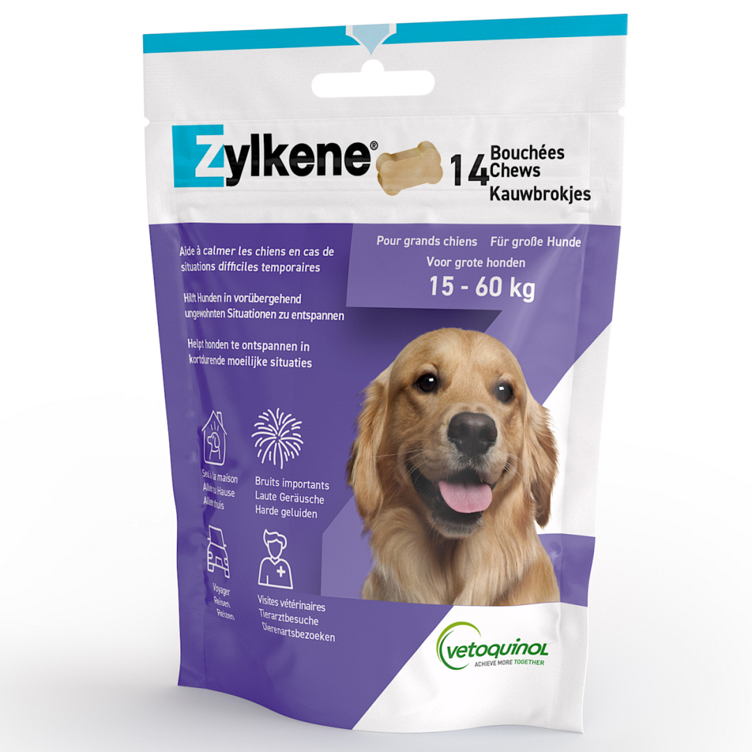 Zylkene Chews Anti Stress is een smakelijk kauwbrokje. Het helpt honden te ontspannen in kortdurende gespannen situaties, zonder te versuffen of risico op gewenning.