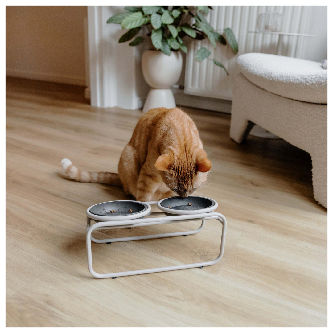 De District 70 Butler verhoogde voerbakstandaard combineert elegantie en functionaliteit. Het verhoogde en gekantelde ontwerp biedt een comfortabele eet- en drinkervaring voor jouw kat, terwijl het minimalistische design moeiteloos in verschillende interieurstijlen past.