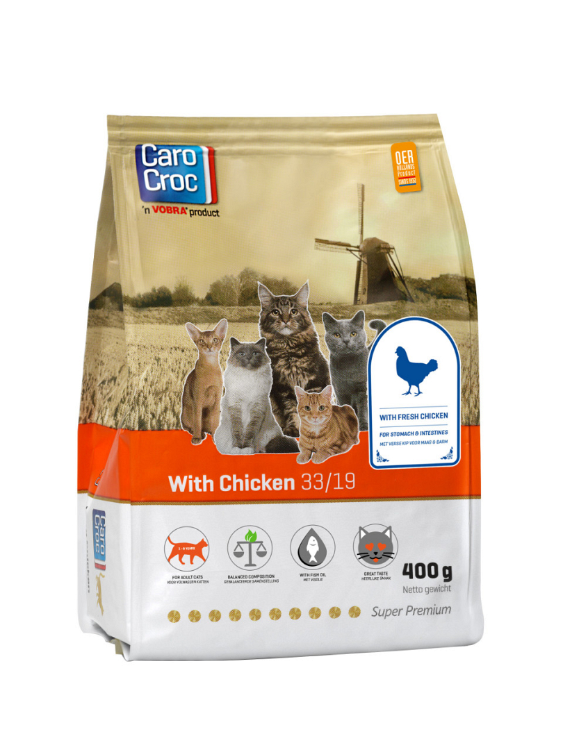 CaroCroc With Chicken bevat een hoog aandeel gevogelte (36%), is zeer smakelijk en licht verteerbaar. Het bevat alle voedingsstoffen die je volwassen kat nodig heeft.