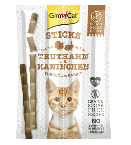 Gimcat kattensnack Sticks met Kalkoen en Konijn is een heerlijke traktatie voor jouw kat. Of je de stick nu in één keer of stukje voor stukje geeft, jouw kat zal smullen. Het recept bevat veel kalkoen en konijn, vitaminen en taurine. De sticks bevatten geen toegevoegde suiker, granen of kunstmatige kleur- en smaakstoffen.