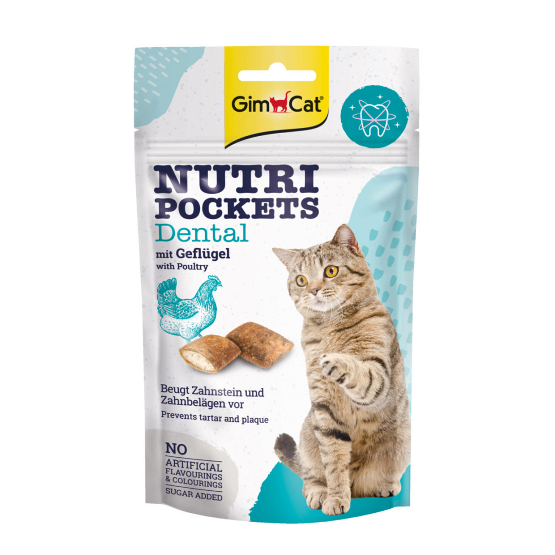 GimCat Nutri Pockets Dental zijn knapperige kussentjes met een heerlijke vulling. Cellulose reinigingsmiddelen ondersteunen de mechanische afslijting van de tandplaque en helpen de vorming ervan te verminderen.
