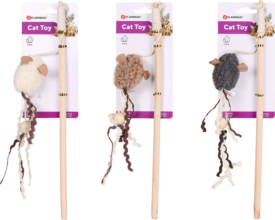Flamingo kattenhengel Suava Muis Assorti is een leuke speelhengel met catnip gevulde muisjes voor extra stimulans tijdens het spel. De staartjes bestaan uit verschillende lintjes met kraaltje.