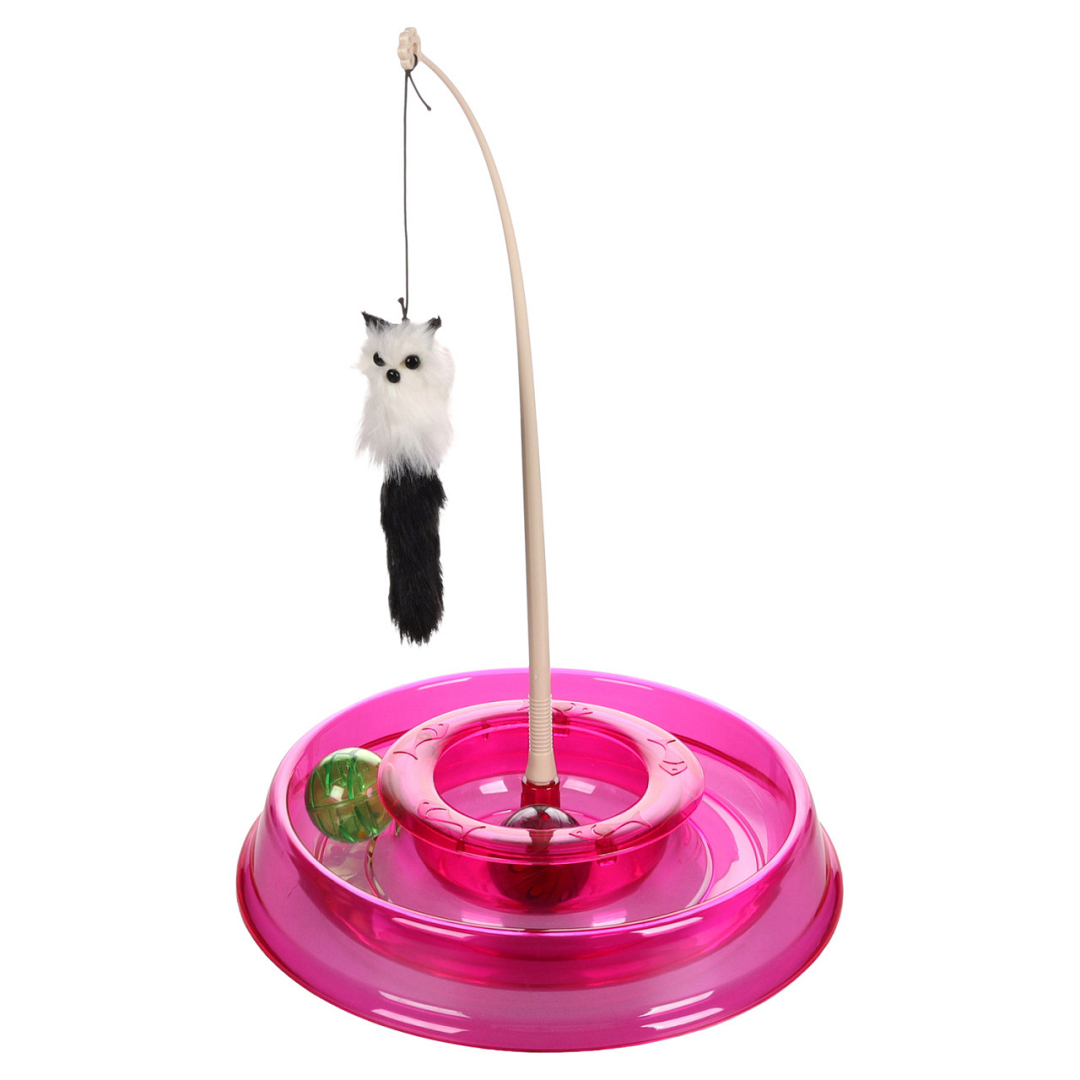 Kleurrijk kattenspeeltje met een circuit vol knikkers en een hengel met knuffeltje.