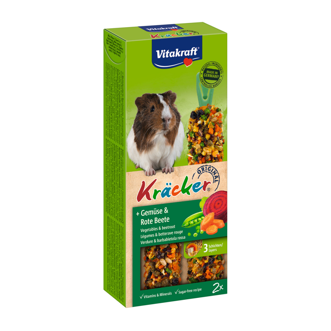 Vitakraft Kräcker Original cavia met groente en bieten is een verantwoorde lekkernij en bevat lekkere granen, groente en bieten op een natuurlijk knabbelhoutje.